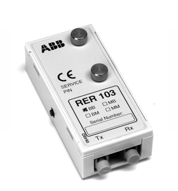 ABB RER 103 总线连接模块是用于RE_500 设备与光纤 SPA、LON® 及 IEC 60870-5-103 总线间的接口单元,可将光纤信号与 RS-485 电信号双向转换,通过 9 针 D 型连接器插接在 RE_500 设备背板并从中取电(5V dc);支持环形(Loop)和星形(Star)两种总线拓扑,拓扑与线路空闲状态(灯亮 / 灭)通过跳线选择,且对应不同协议(SPA 仅环形 + 灯灭,LON® 仅星形 + 灯灭,IEC 103 支持星形 + 灯亮 / 灭);提供塑料光纤、玻璃光纤两类连接器组合(4 种型号),玻璃光纤最大传输距离 1000m、塑料光纤 10m,最高数据传输速率 1.25 Mbps,工作温度范围 - 10...55°C。