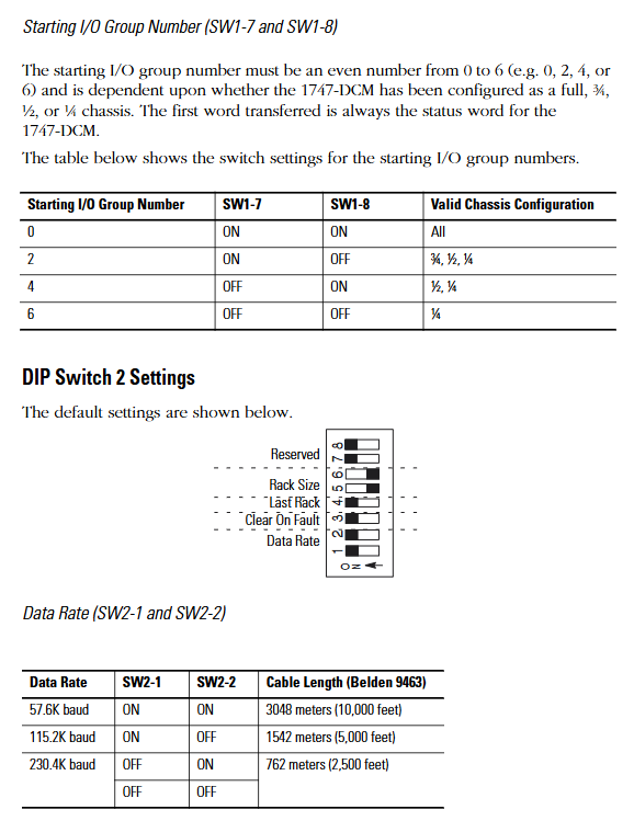 1747-DCM 含 2 组 8 位 DIP 开关(SW1、SW2),需在安装前完成配置,关键参数如下: