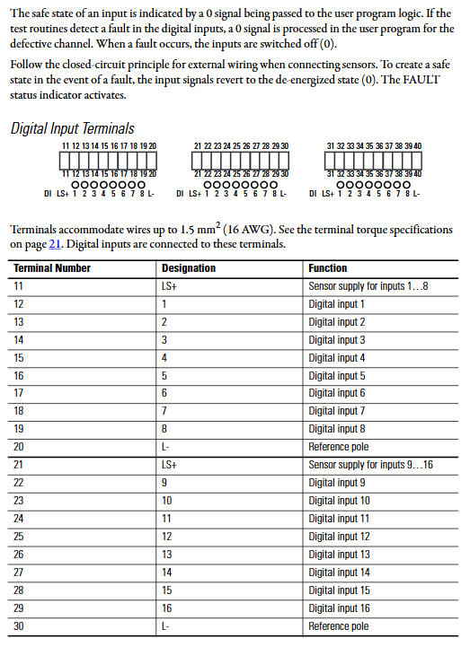 端子规格:端子支持 0.13~1.3mm²(26~16 AWG)导线,拧紧扭矩 0.51N・m(4.5 lb・in),端子 11-20、21-30、31-40 分别对应 3 组输入的 LS+、输入通道、L-。