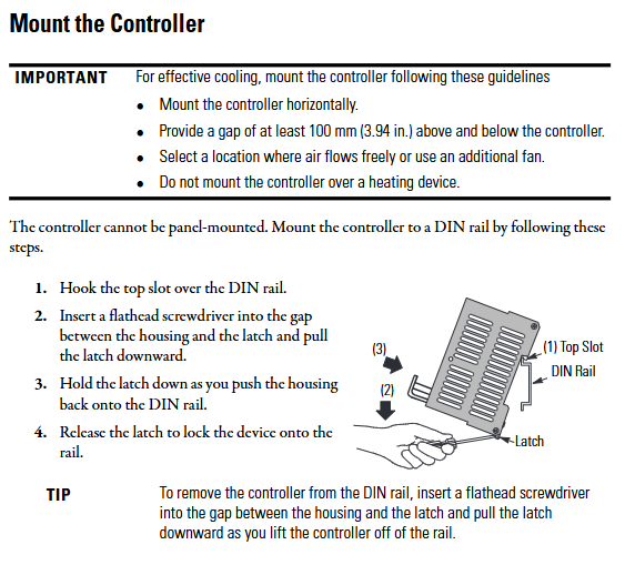 对准导轨:将控制器顶部卡槽挂在 IEC 标准 DIN rail(如 199-DR1)上,导轨推荐使用镀锌黄铬钢材质(确保接地良好),每 200mm(7.8 英寸)固定一次并加装端锚。