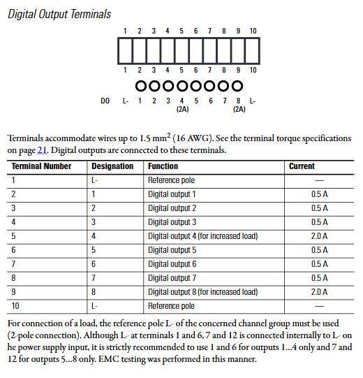 接线要求:输出回路需使用对应组的 L-(端子 1/10)作为公共端,即使 L - 内部连通,仍推荐按组使用(EMC 测试验证配置);感性负载建议并联 1N4004 二极管抑制干扰电压。