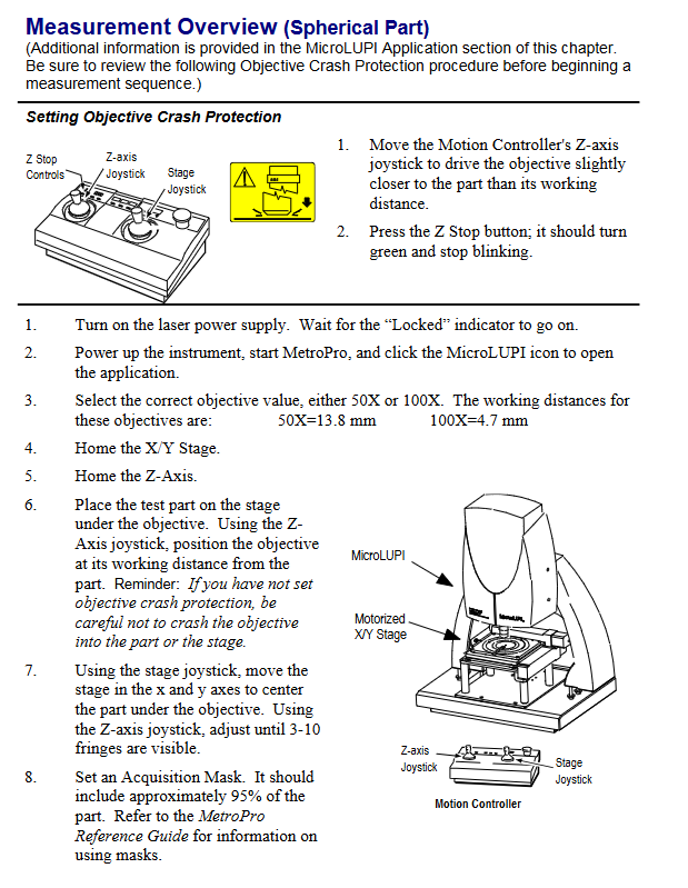 选择匹配物镜(50X 工作距离 13.8mm,100X 工作距离 4.7mm),放置被测件并通过载物台操纵杆居中