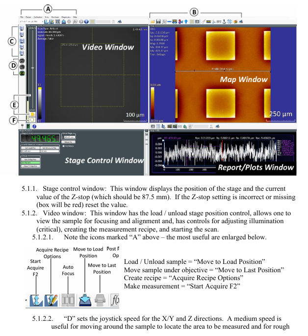视频窗口(Video Window) 载物台加载 / 卸载控制、样品对焦 / 对准、光强调节、测量配方创建、扫描启动 含核心功能图标:“Move to Load Position(加载位置)”“Start Acquire F2(启动测量)” 等