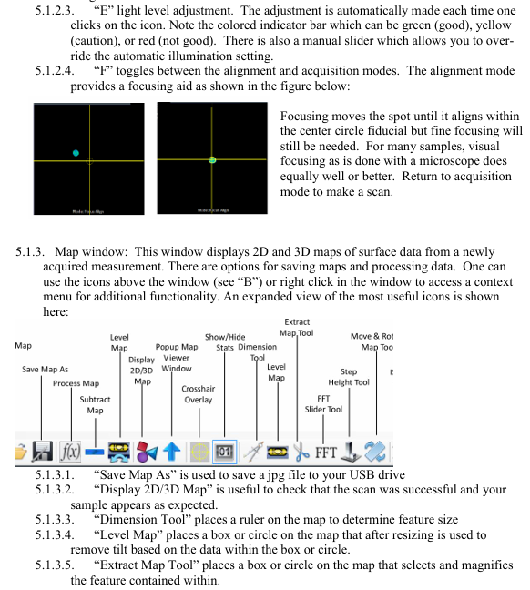 地图窗口(Map Window) 显示 2D/3D 表面数据图,支持数据保存、倾斜校正、区域放大 常用图标:“Save Map As(保存为 JPG)”“Level Map(倾斜校正)”“Dimension Tool(尺寸测量)”