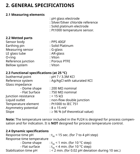 机械性能 主体材质 PPS 40GF,接触介质部件含 Viton(O 型圈 / 波纹管)、PTFE(参比 junction)、铂(接地针);最大拧紧扭矩 7.5 Nm,接口为 1 英寸 NPT 螺纹;