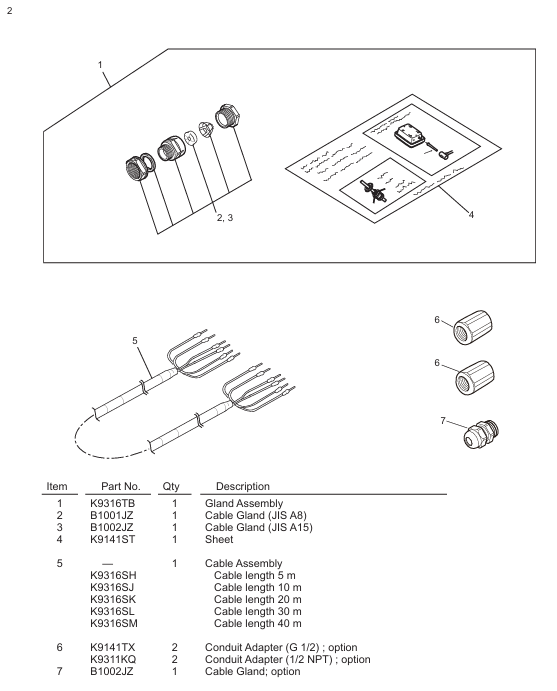 无导管:将 JIS A15 级密封套(B1002JZ)按 “帽→夹紧爪→橡胶垫片→主体→垫片→螺母” 的顺序套在延长电缆上,电缆穿入端子箱后固定螺母;