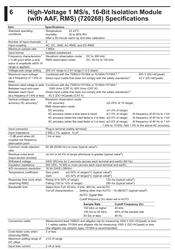 720268(1 MS/s,16 位,隔离,带 AAF/RMS) 2 通道,DC-300 kHz 带宽,自动抗混叠滤波(AAF),5400 Vrms 耐电压 高压高频信号采集,AAF 根据采样率自动调整截止频率(如 100 kS/s 时 AAF=40 kHz)