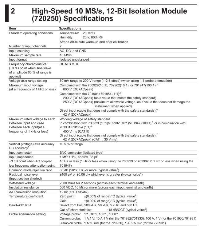 701250(10 MS/s,12 位,隔离) 2 通道,DC-3 MHz 带宽,±50 mV~200 V 量程,2300 Vrms 耐电压 工业高频电压信号(如电机驱动信号)