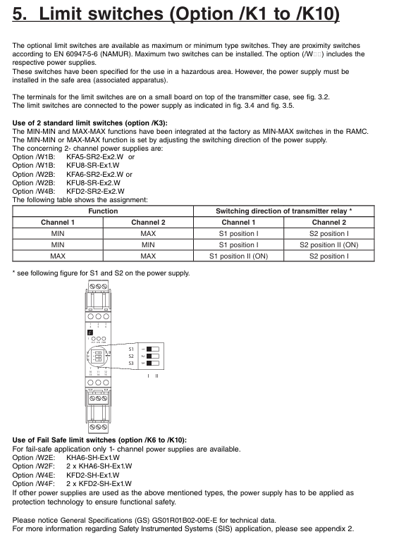 参数配置:通过电源切换方向设置 MIN-MAX/MIN-MIN/MAX-MAX 功能,如 / K3 选项搭配 / W2B 电源时,S1/S2 继电器位置决定触点逻辑。