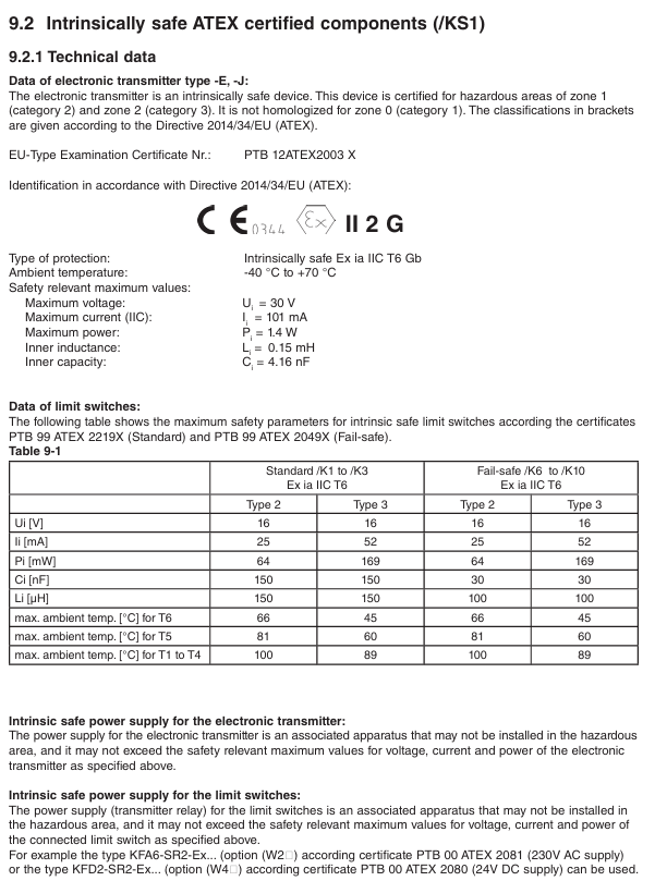 ATEX /KS1(本质安全) Ex ia IIC T6 Gb 1 区 / 2 区(气体)、21 区 / 22 区(粉尘) Ui=30V,Ii=101mA,Pi=1.4W