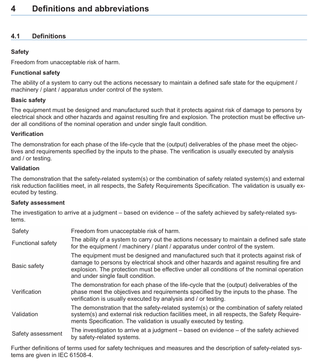 核心定义:明确 “安全(Safety)”“功能安全(Functional safety)”“基本安全(Basic safety)”“验证(Verification)”“确认(Validation)”“安全评估(Safety assessment)” 等术语,符合 IEC 61508-4 标准相关解释。