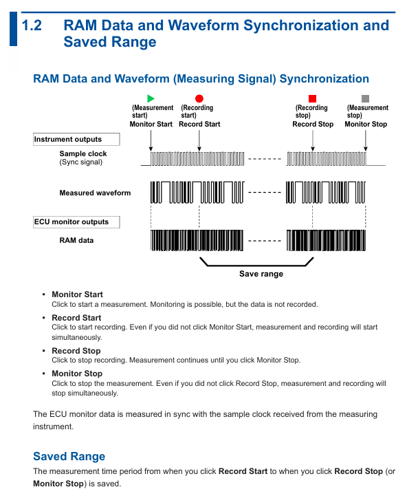 启动 ECU 监控器(进入时钟待机)→ 按下测量仪器 “START” 键(输出采样时钟,ECU 开始获取 RAM 数据)→ 按下测量仪器 “STOP” 键(停止时钟与 RAM 数据获取)→ 停止 ECU 监控器;