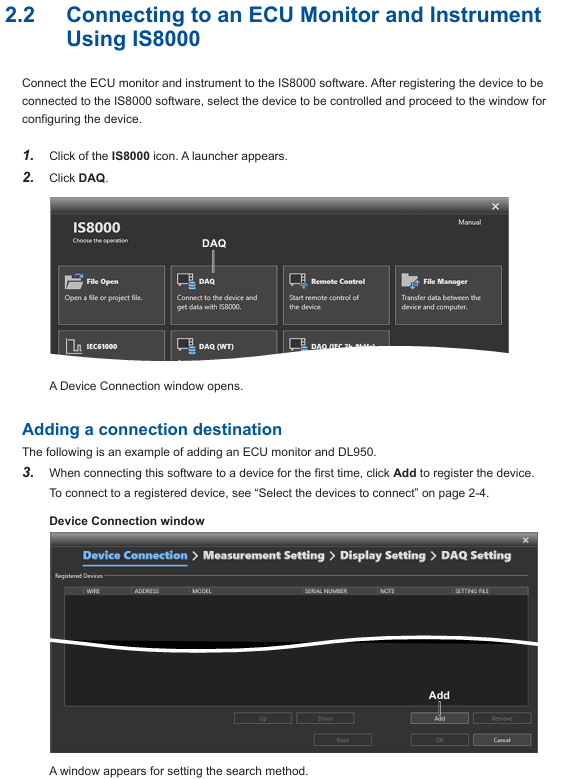 |2 | 首次连接时点击 “Add”,选择通信方式(以太网 / USB)后点击 “Search” 搜索设备 |