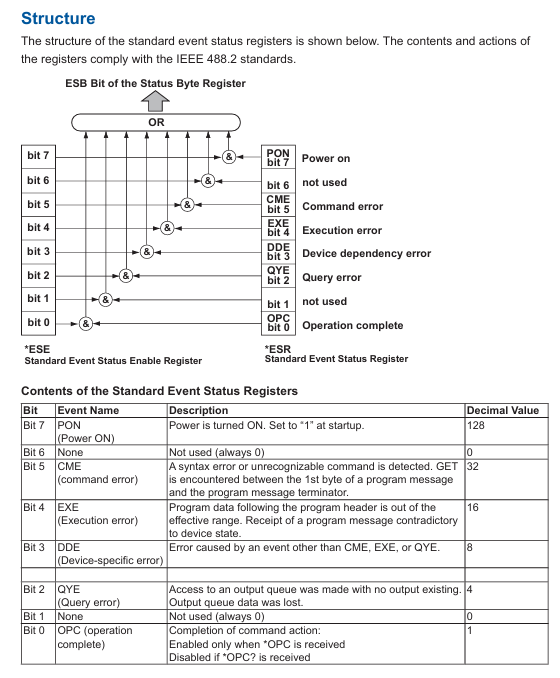 8 位寄存器,记录设备事件,如 PON(电源开启,bit7)、CME(指令错误,bit5)、OPC(操作完成,bit0);