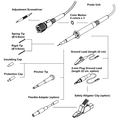 标准附件:包含探头主体(701944/701945)、弹簧尖端(预装)、刚性尖端、钳形尖端、绝缘帽、保护帽(预装)、接地线(22cm)、彩色标记(4 色 ×3 个)、调节工具及手册,所有附件需在开箱后确认齐全且无损坏,避免影响使用。