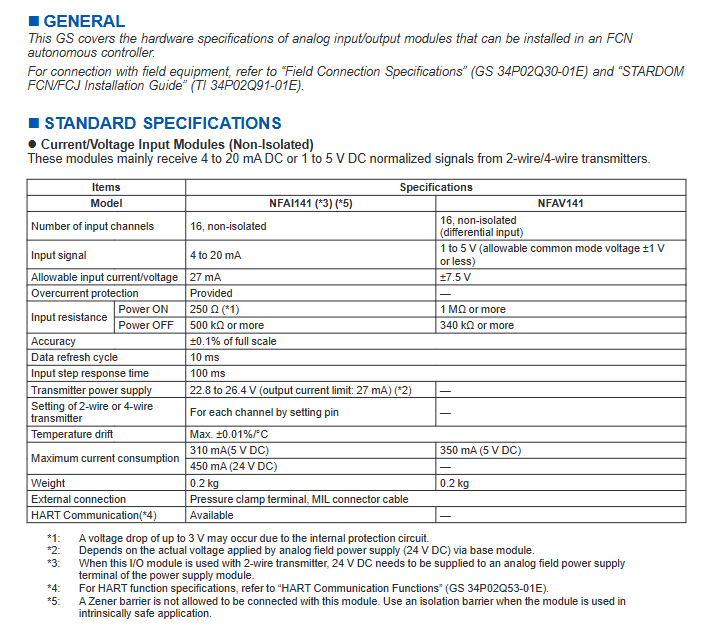横河电机 NFA 系列模拟 I/O 模块的硬件规格,适用于安装在 FCN 自主控制器中,详细说明各类模块的技术参数、功能特性、安装限制及型号编码规则,同时提及外部连接、电源供应等配套要求,部分内容需参考关联文档(如现场连接规范、HART 通信功能说明)。